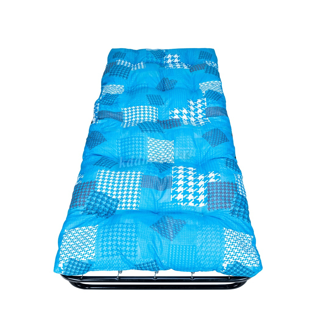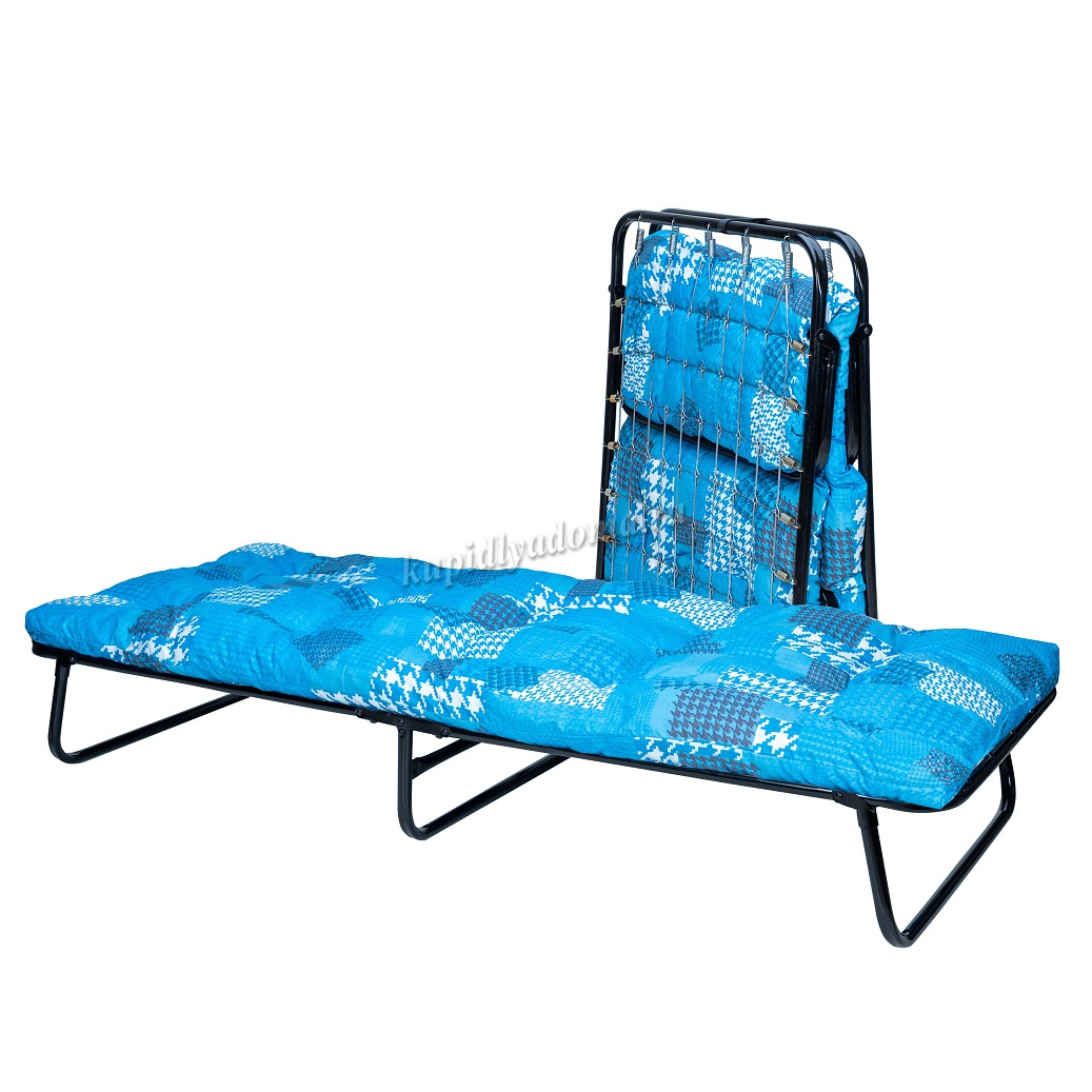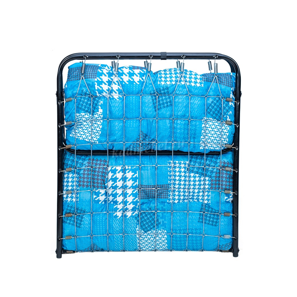 Раскладная кровать 202 модели имеет мягкий, пышный матрас с наполнением из поролоновой кроши толщиной 10 см. Основание кровати – оцинкованная сетка, диаметр стальных труб каркаса 25 мм., благодаря чему кровать выдерживает нагрузку до 150 кг.