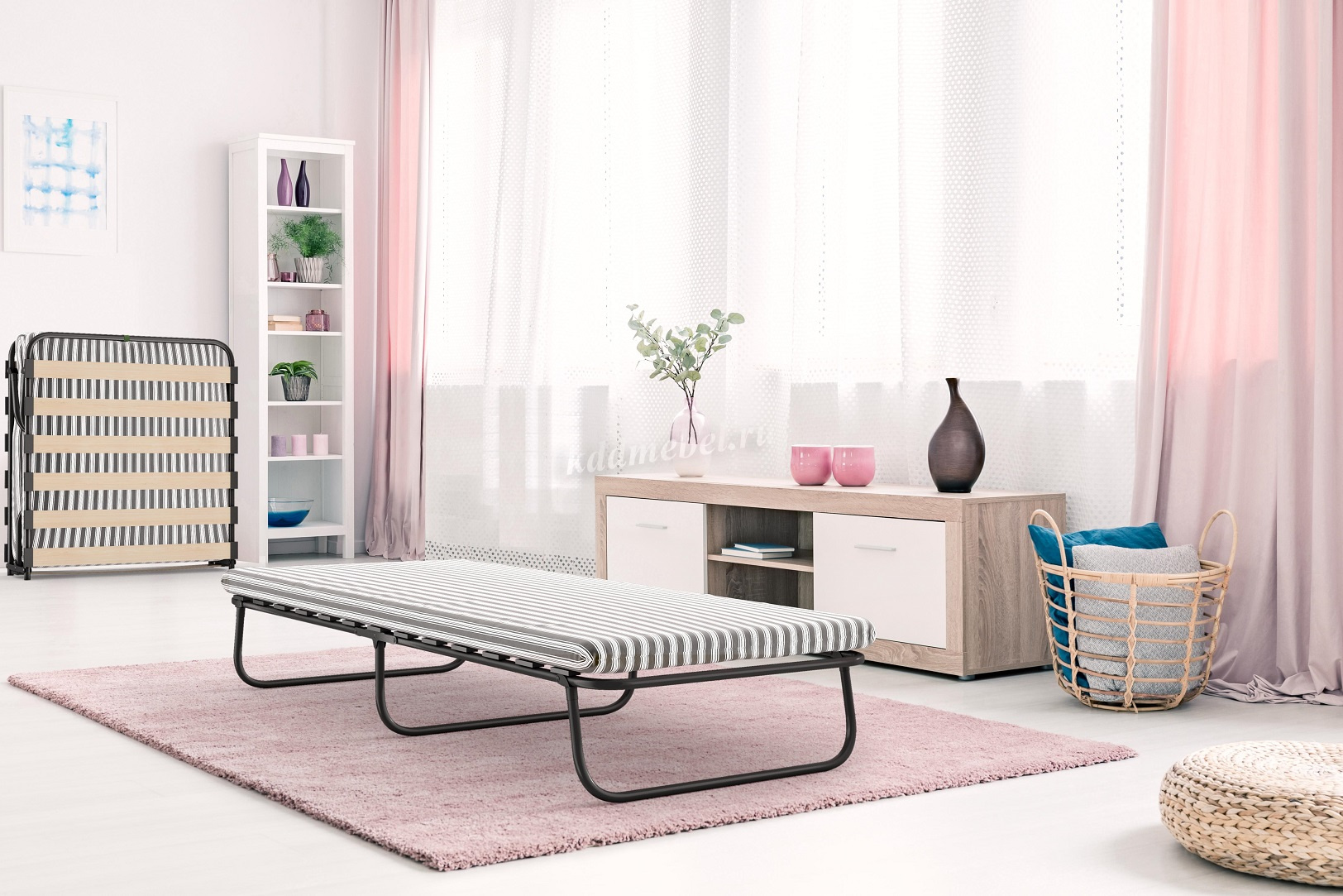 Раскладная кровать 203 обладает большим запасом прочности благодаря каркасу из стальных труб диаметром 25 мм. и выдерживает нагрузку до 120 кг. Тип основания - ламели, которые обеспечивают особенно удобный отдых. Наполнение матраса – листовой поролон толщиной 5 см.