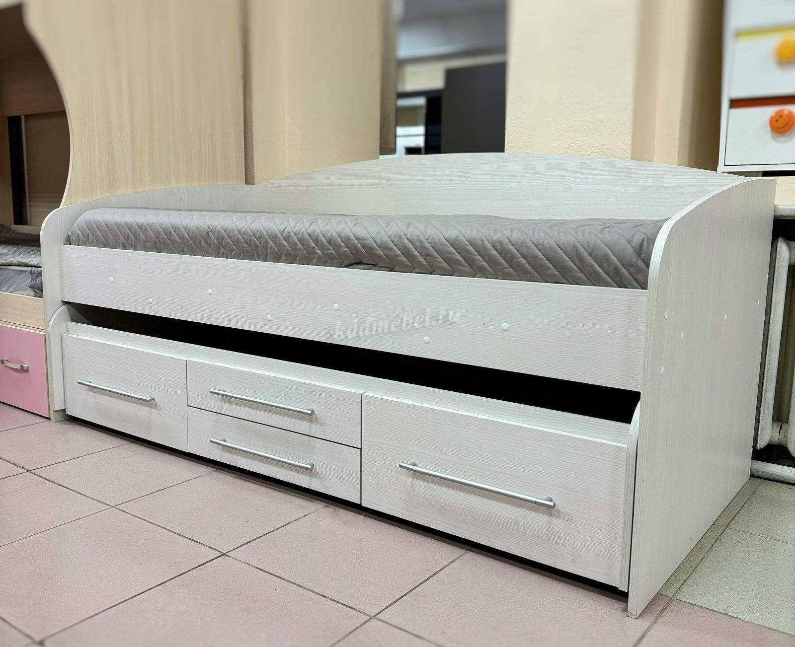 Двухъярусная детская кровать «Адель-5» имеет весьма необычную компоновку. У неё выдвижное нижнее спальное место, благодаря чему общая высота кровати составляет всего 66 см. Нижний блок оснащён двумя парами больших и малых выдвижных ящиков для постельных принадлежностей, а также колёсиками, поэтому для его выдвигания вам не потребуется значительных усилий. Размеры спальных мест отличаются. Кровать оборудована боковинами и задней спинкой.