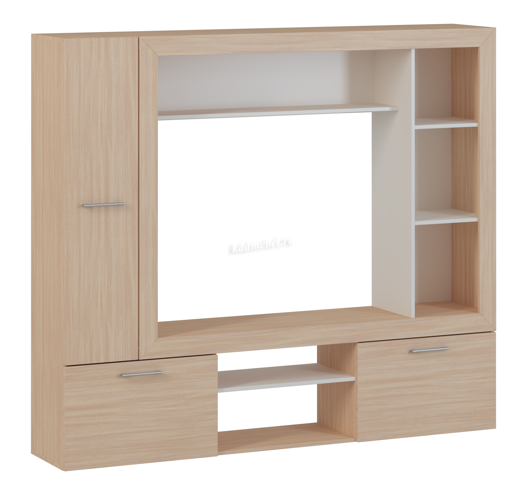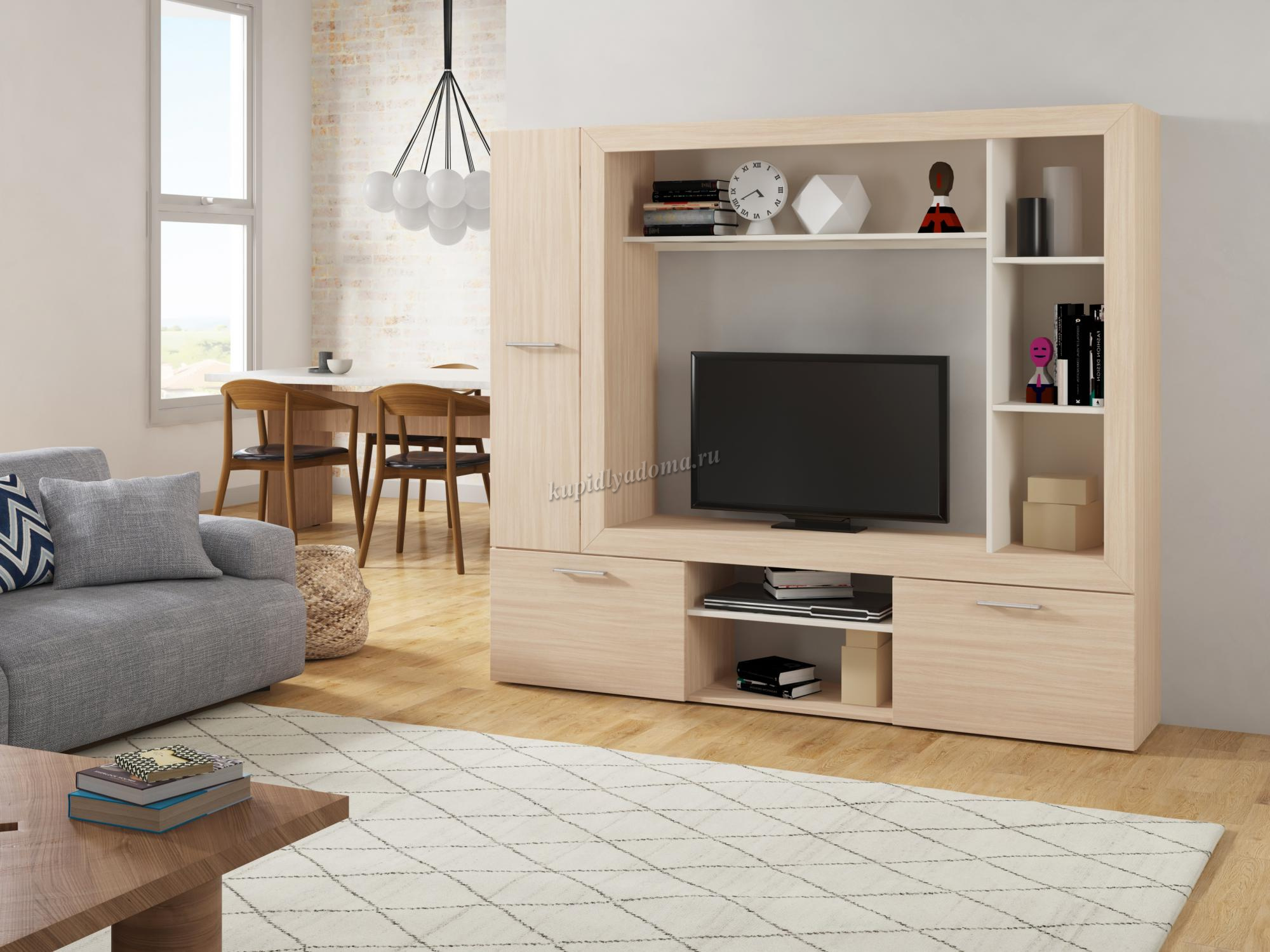 Компактная гостиная для небольших помещений или для тех, кто не хочет заставлять комнату большими конструкциями. В Гостиной «Oskar-3» предусмотрены открытые и закрытые полки для хранения мелочей, бумаг, книг. Место для телевизора и аппаратуры. Закрытые отделения для хранения белья, а так же полка для сувениров и фотографий. Отличительной особенностью гостиной является багетная рамка, которая придает гостиной современный вид.
