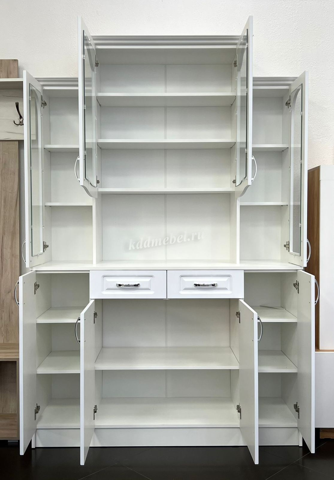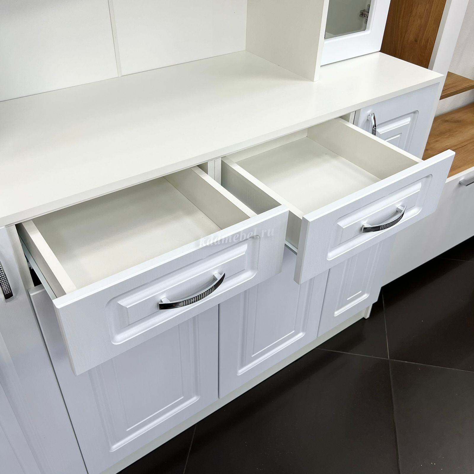 Корпус из ЛДСП белого цвета с тиснением «Древесные поры», фасады из плиты МДФ, облицованные высококачественной матовой пленкой ПВХ толщиной 0,3 мм.