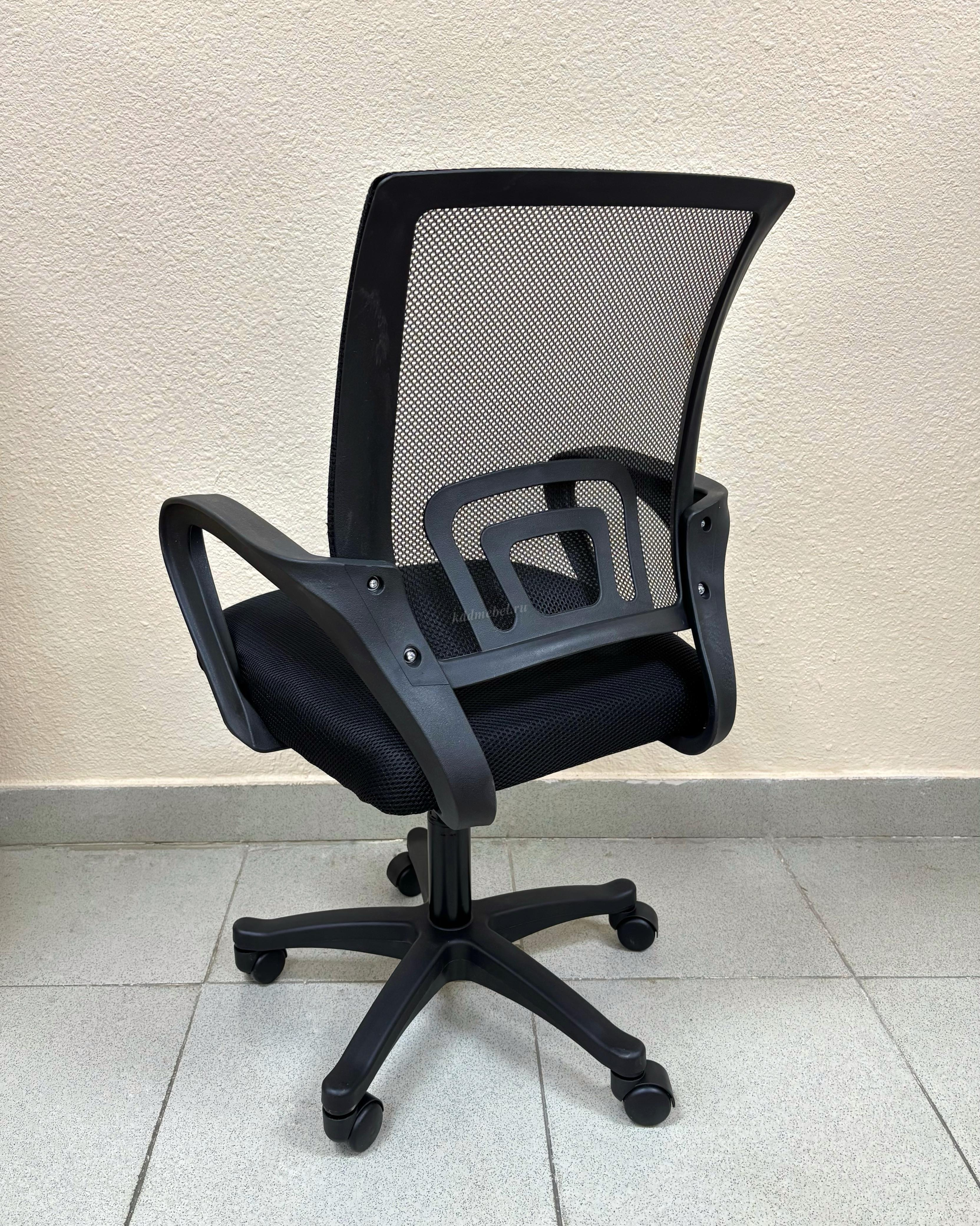 Современное офисное кресло с удобной спинкой, сиденьем из акриловой сетки и устойчивым пятилучным пластиковым основанием, снабжённым 50-мм двойными колёсиками.