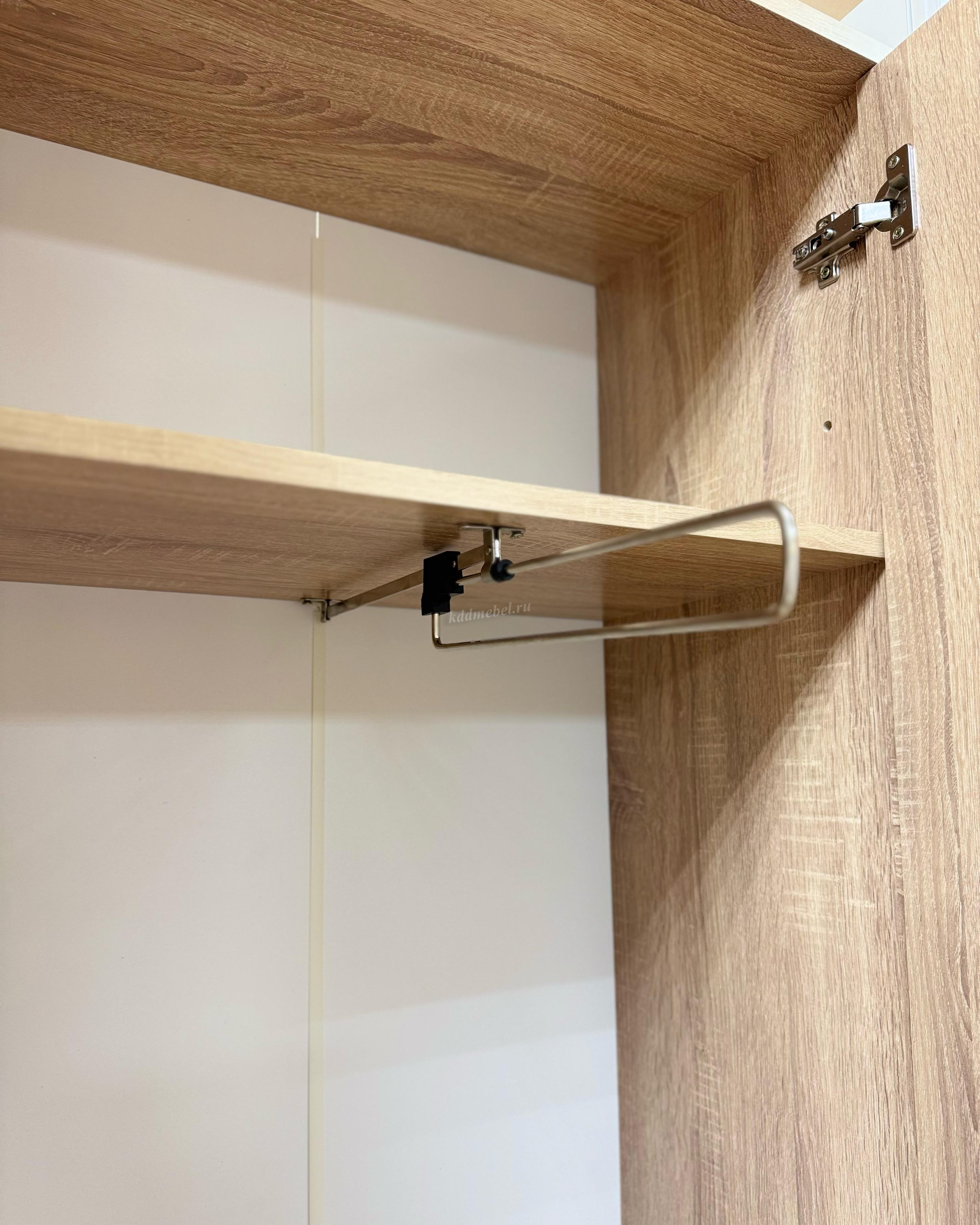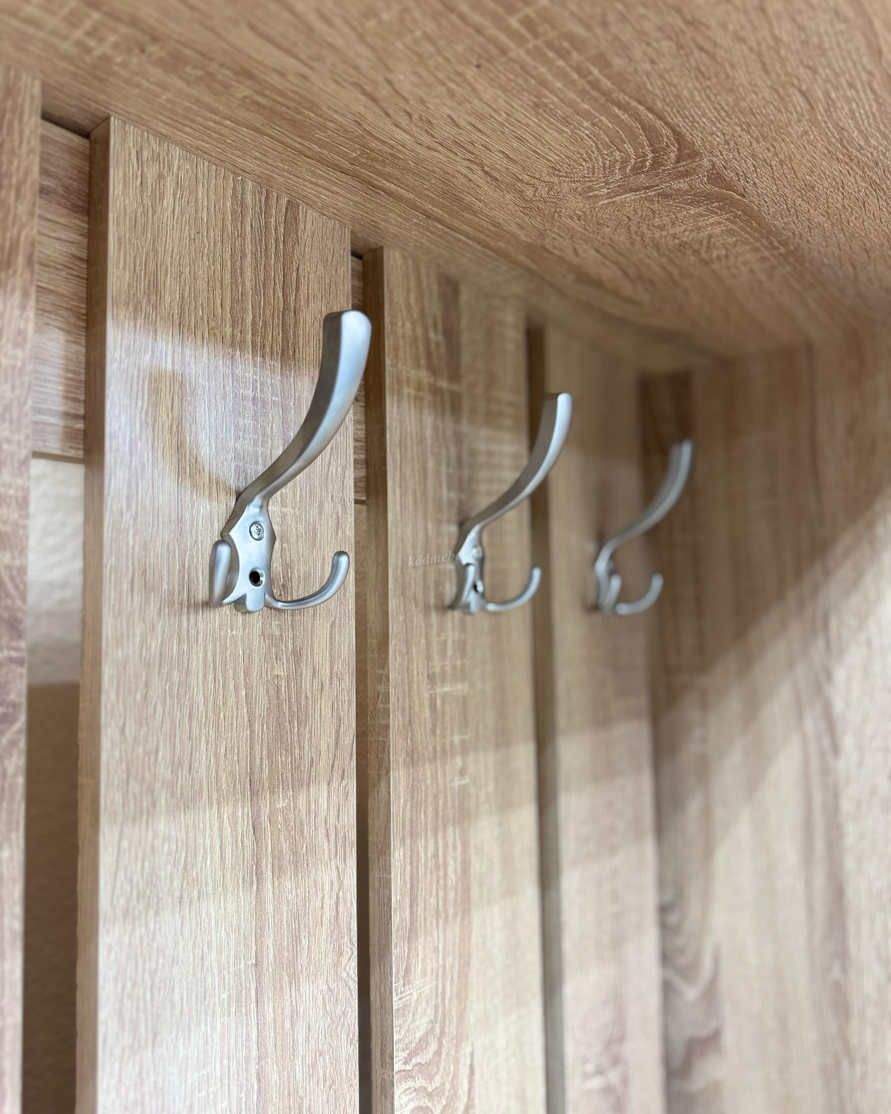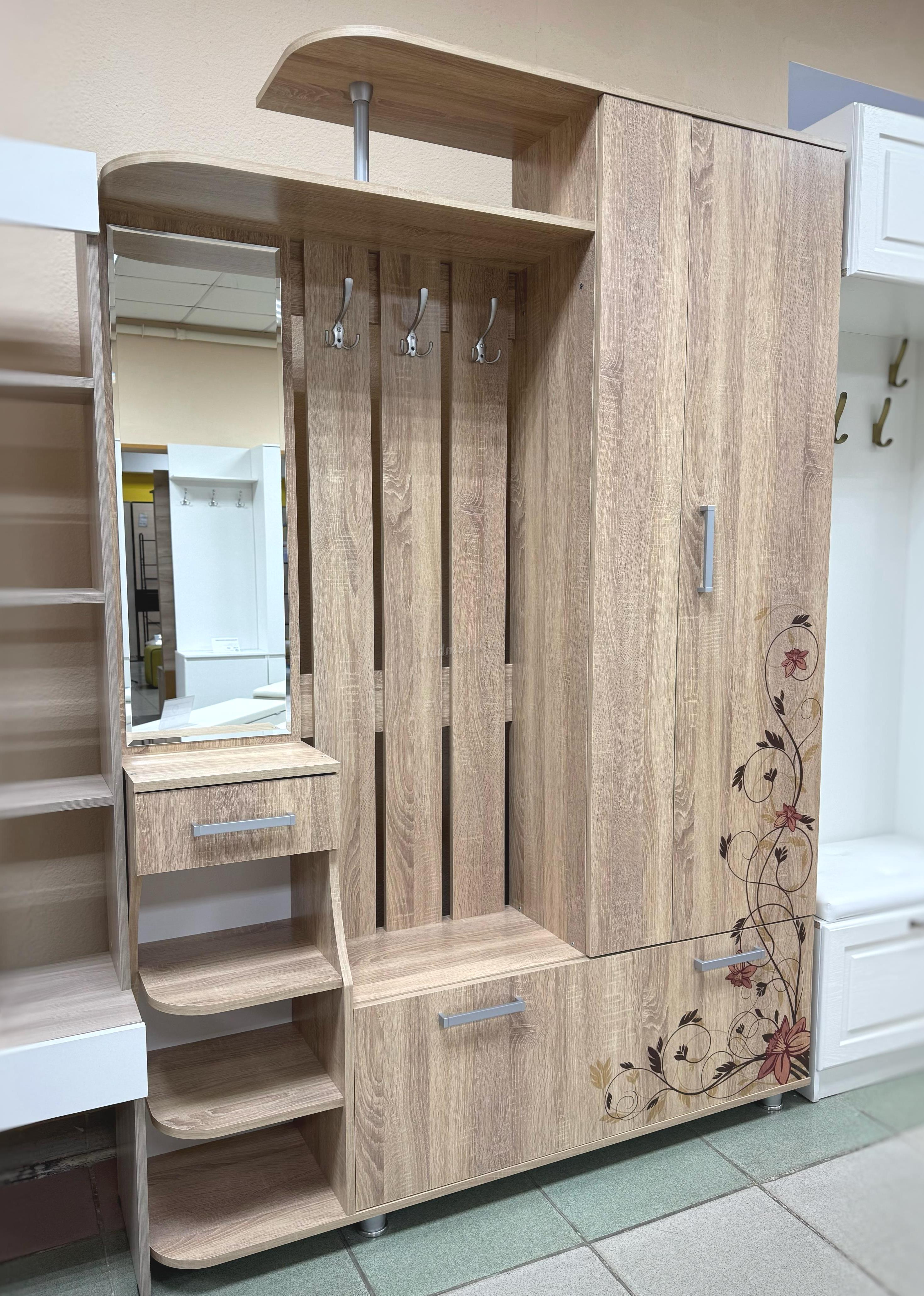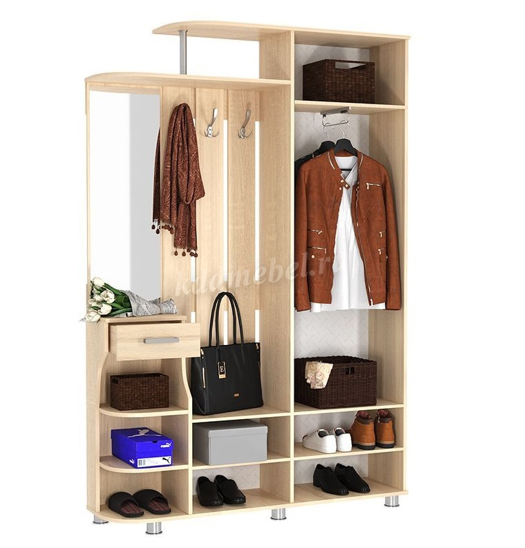 Состоит из: шкафа с выдвижной штангой, вешалки с крючками для одежды и сумок, обувницы, открытых полок, зеркала, полки для головных уборов, выдвижного ящика. Сборка универсальная.