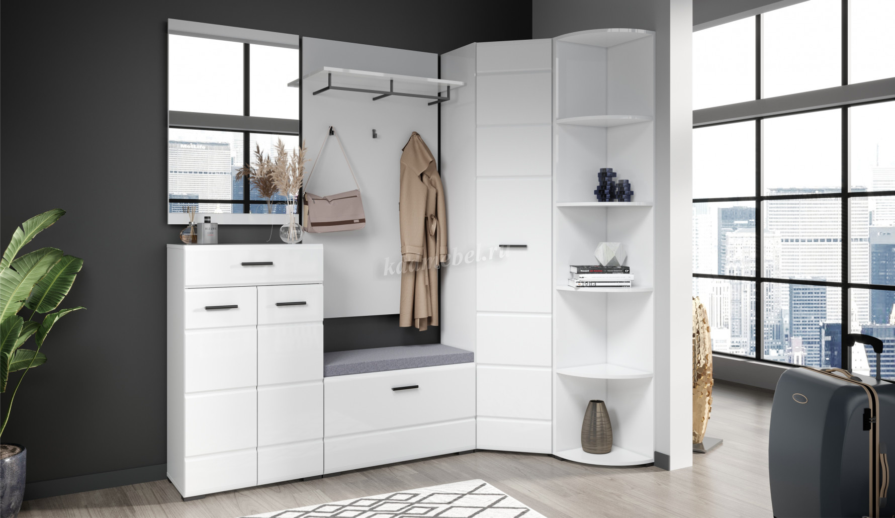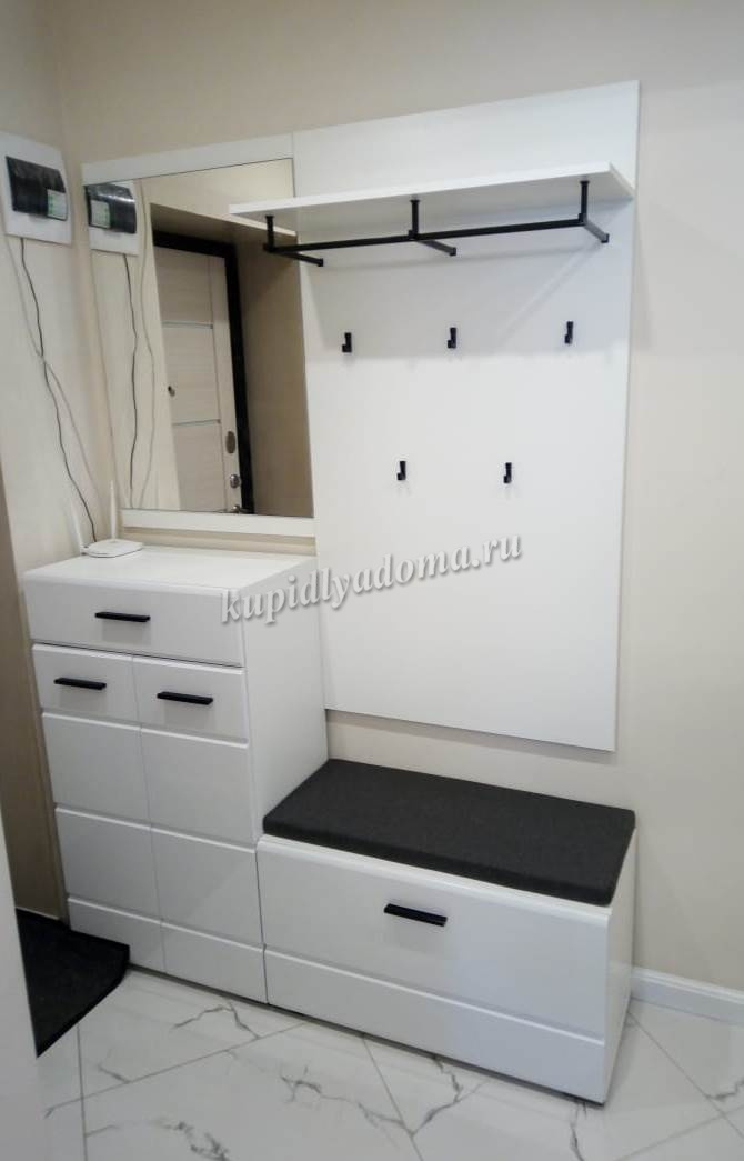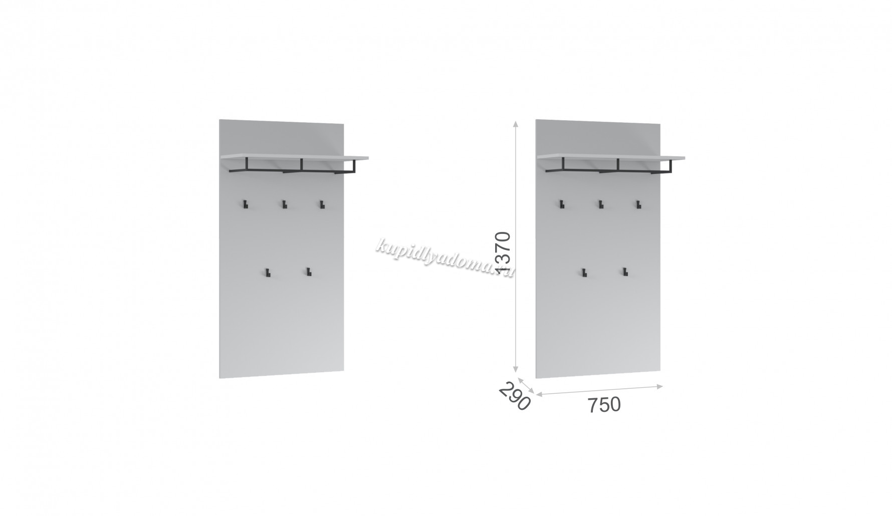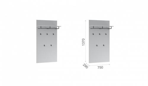 Компактная и функциональная вешалка из белого ЛДСП включает в себя самое необходимое для организации хранения в прихожей. Верхняя полка разместит головные уборы, а металлическая штанга и пять крепких крючков контрастного черного цвета поместят на себе одежду объемом с небольшой шкаф. Идеально компонуется со всеми модулями системы Йорк