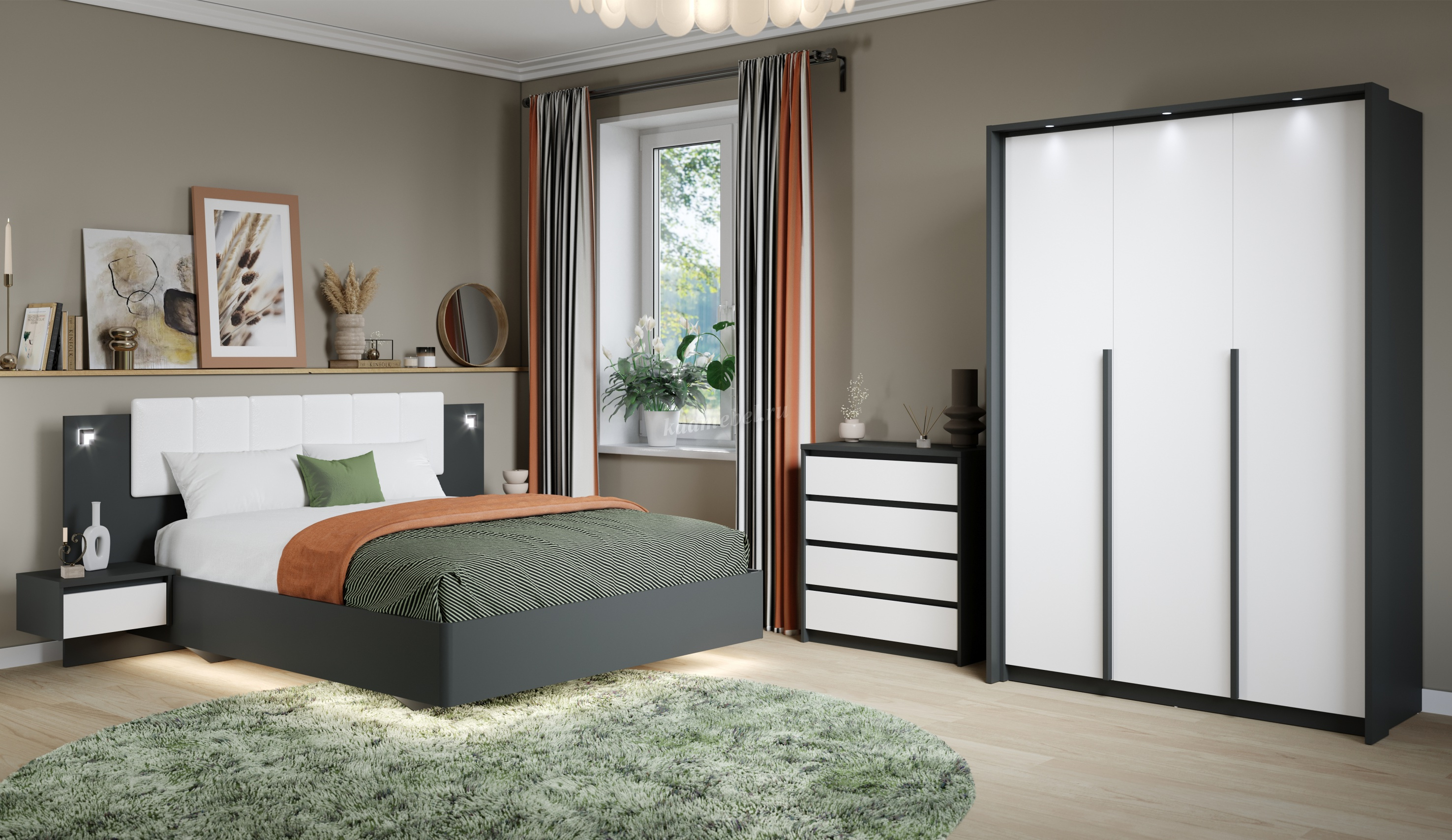 Мишель – это современная спальня с лаконичными формами и строгой геометрией в актуальных цветах. Отсутствие лицевой фурнитуры в ящиках и комодах подчеркивают минималистичный дизайн спальни.