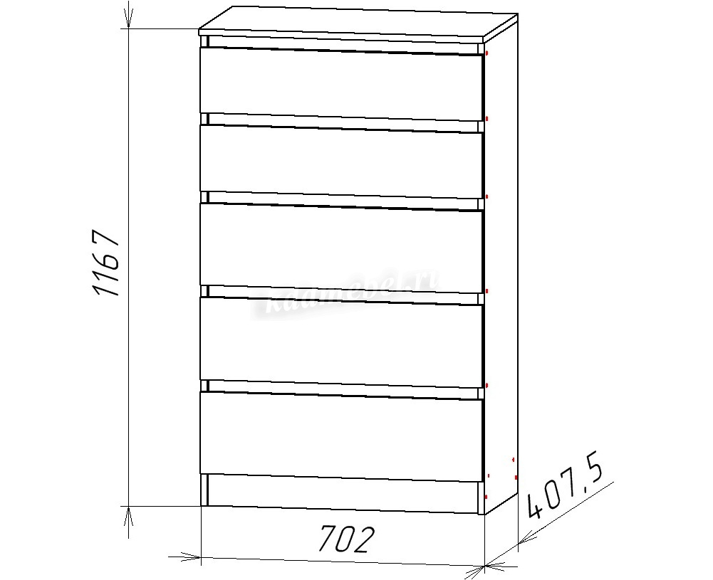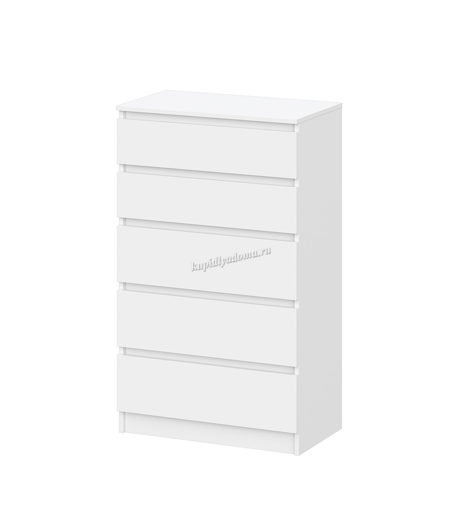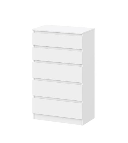 Высокий комод с пятью ящиками. Два верхних ящика поуже, 3 нижних глубокие. Направляющие НПВ шариковые. Ящики без ручек. Выемка для открывания