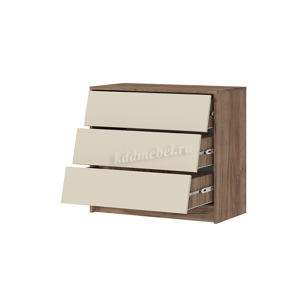 Корпус комода выполнен в текстуре натурального дерева, придающей изделию тёплый и уютный вид. Три вместительных выдвижных ящика на металлических направляющих обеспечивают удобный и плавный ход. Идеально подойдёт для спальни, гостиной или прихожей.
