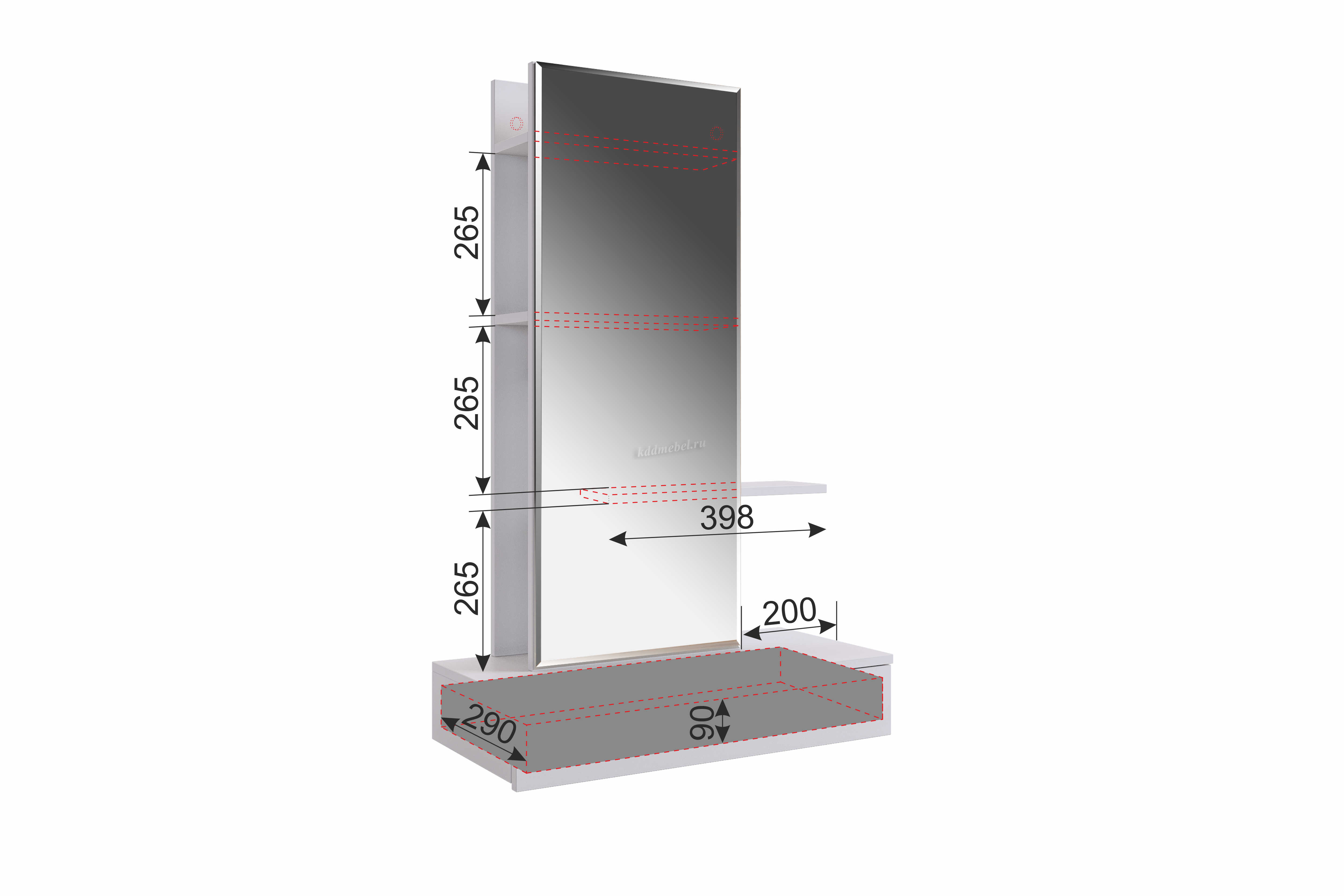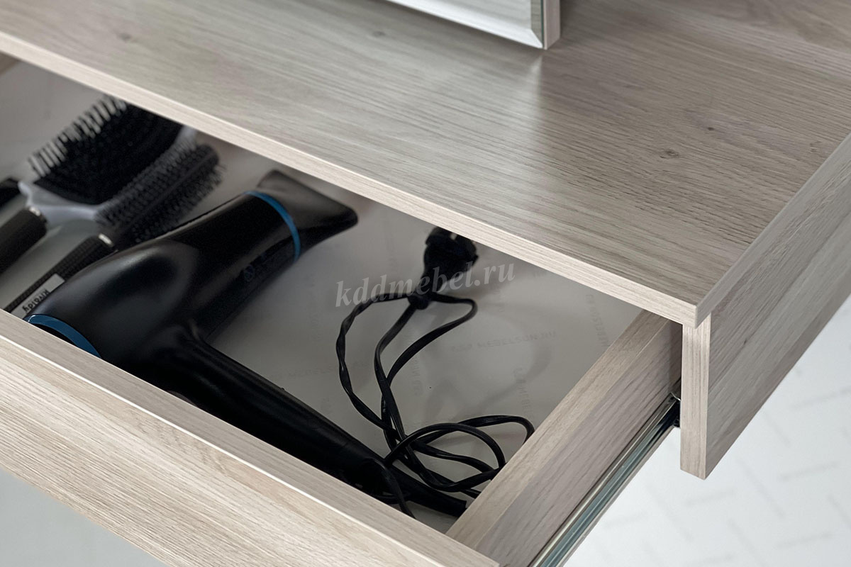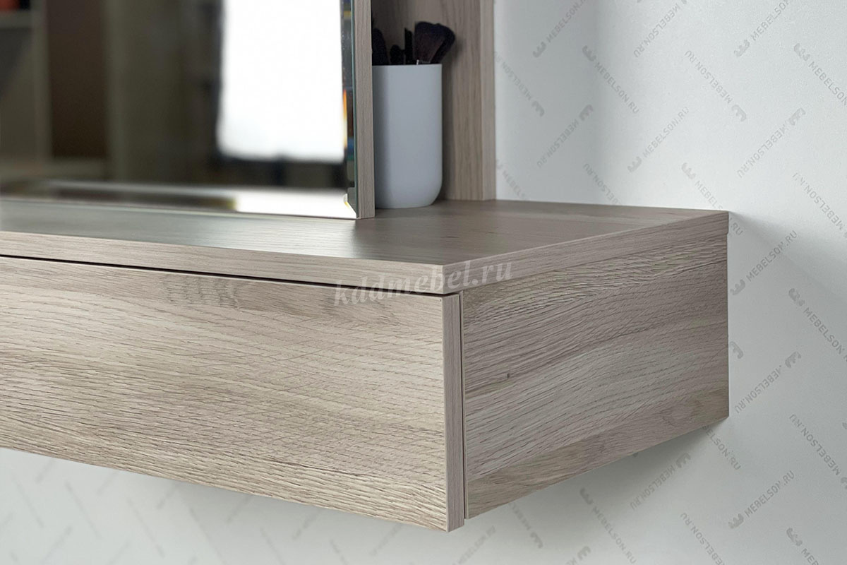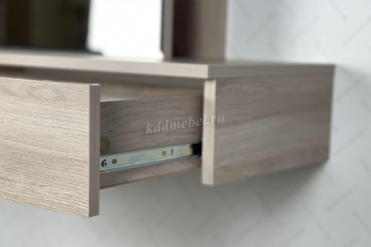 Сборка у трюмо универсальная. Зеркальную панель с полками можно установить ближе к левому либо ближе к правому краю. Так же полки за панелью крепятся в разных положениях.