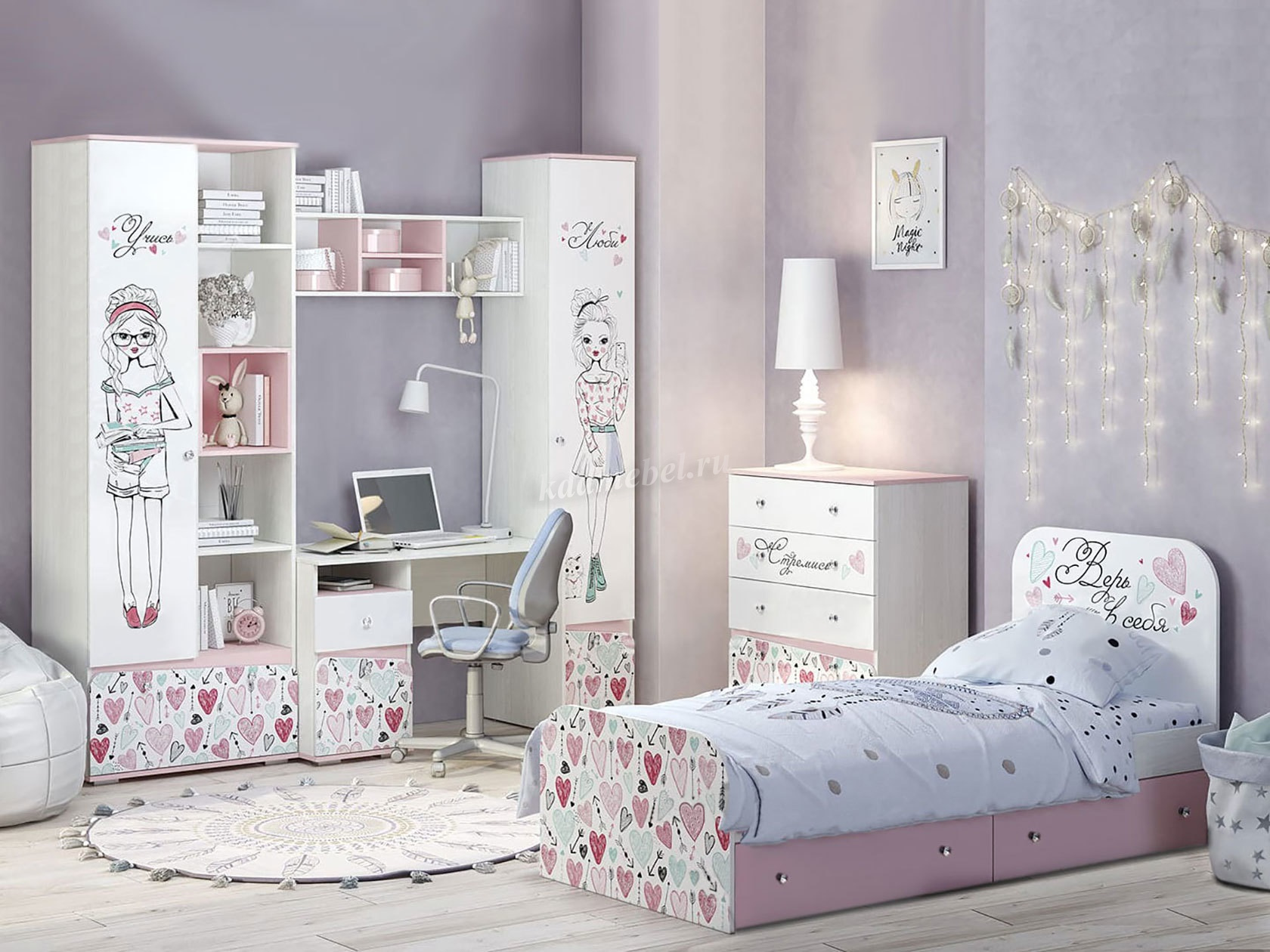 Нежные пудрово-розовые тона Детской Малибу прекрасно сочетаются с классическим светлым декором корпусов и фасадов, на которые нанесен скетч-принт. Малибу - модульная система для детской комнаты, в которой проводит свое время девочка, верящая в себя, целеустремленная, постоянно познающая все новое и неизвестное, излучающая любовь и гармонию!