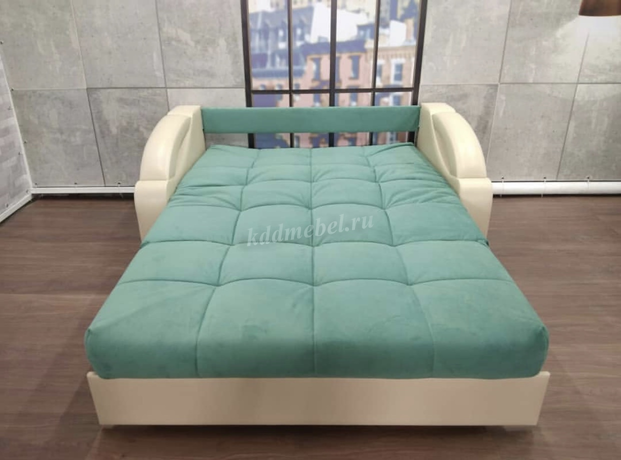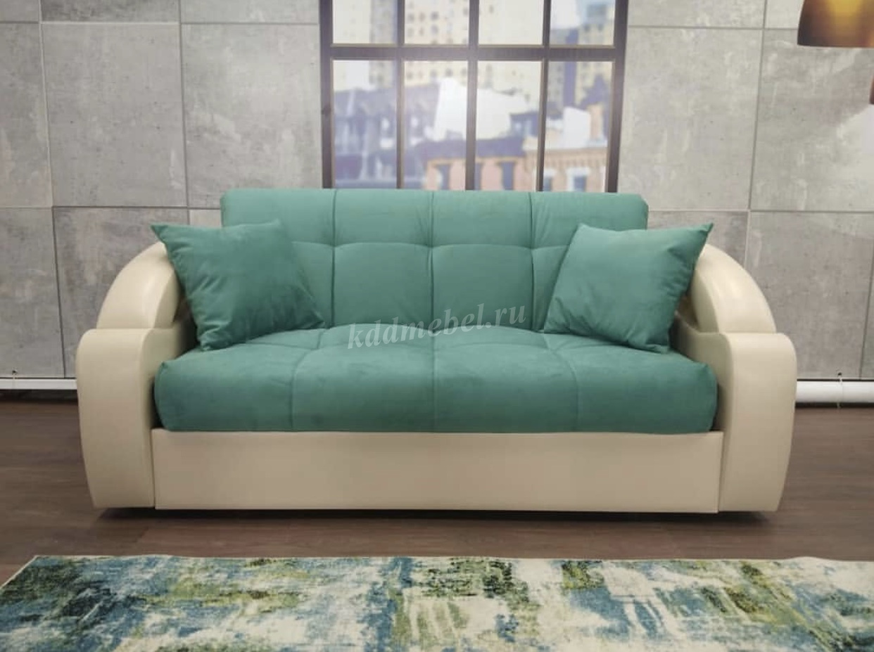 Стильный современный диван. Мягкие дугообразные подлокотники. Ровное спальное место. Возможность использования в качестве центрального объекта интерьера. В основании спального места металлический каркас с поддерживающими деревянными латами и механизмом трансформации «аккордеон». Матрас на эластичном ППУ. Съемный чехол спального места. Спальное место формируется следующим образом: цокольная часть сиденья выдвигается вперед до упора, спинка, состоящая из сложенного листового пенополиуретана, раскладывается. Для трансформирования не требуется расстояние между стеной и диваном. На фото показана модель дивана, расцветку возможно сделать под заказ или выбрать по наличию на складе. Цена может меняться в большую или меньшую сторону, в зависимости от ткани.