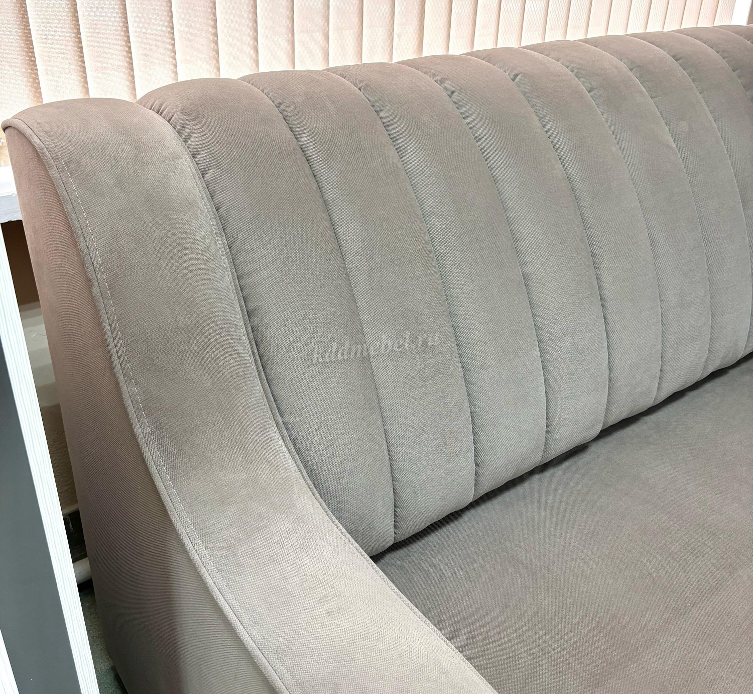 На спинке дивана есть небольшие затяжки ткани, на подлокотнике частично по шву нет ниток.